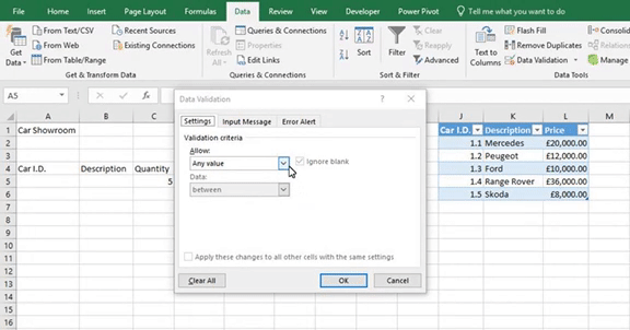 To create an Error Alert go to the Data tab and choose Data Validation. Next click on the Error Alert tab. On this tab you will have a dropdown with three options, Stop, Warning and Information.